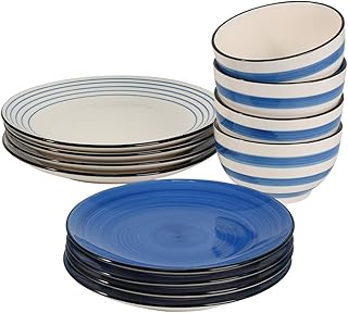 ProCook Coastal - Service de Table en Grès - 12 Pièces/4 Personnes - Grande Assiette Plate/Assiette à Dessert/Bol - Glaçure Réactive - Bleu