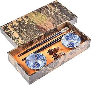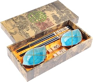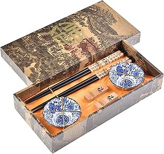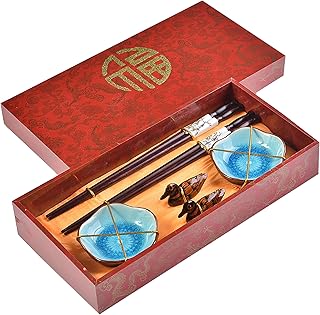 Quantum Abacus Précieux Set de Baguettes Chance d'or et Pagode Bleue en Bois sculpté avec 2 Paires de Baguettes, 2 Supports, 2 Bols en céramique, dans Une boîte Cadeau, Mod. I_S2-B-W-10